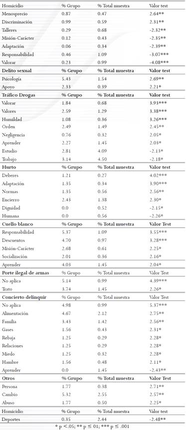 Junto a cada palabra aparece el porcentaje que dicho vocablo representa en el 100% de palabras emitidas por cada grupo. Con relación a las personas condenadas, la Tabla 6 muestra las diferencias encontradas en cada tipo de delito con relación a la muestra total acerca de las evocaciones sobre el tratamiento penitenciario. En lo que concierne a los funcionarios penitenciarios, también se hallan representaciones sociales específicas de las áreas y cargos penitenciarios. Los resultados se muestran en la Tabla 7, aunque solamente se mencionan los subgrupos cuyas especificidades de vocablos arrojan coeficientes de valor test superiores a 2,0.
