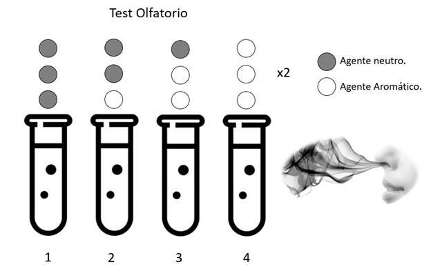 La prueba piloto se realizó con 32 sujetos sin antecedentes psiquiátricos, médicos o neurológicos de consideración y se utilizaron los olores de menta y limón. Estas dos esencias fueron dispuestas en dos grupos de cuatro probetas, las cuales tenían el mismo volumen de contenido (tres gotas), pero en concentraciones de esencia diferentes. La primera probeta solo contuvo tres gotas de agua y la segunda dos gotas de agua y una gota de esencia, la tercera una gota de agua con dos gotas de esencia y la cuarta tres gotas de esencia únicamente; esta presentación fue la misma para ambos olores (Ver Figura 1).
