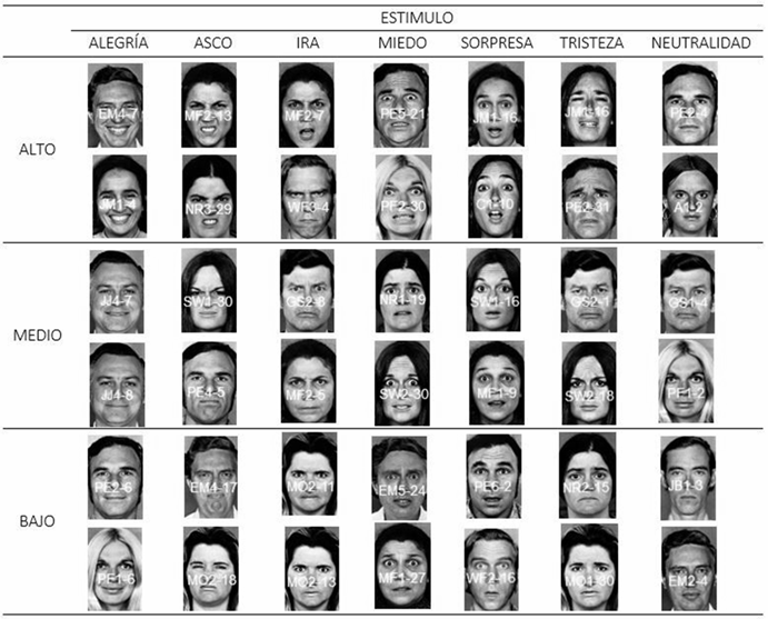 Picture of Facial Affect (POFA). Para la evaluación del reconocimiento emocional fue utilizada la adaptación del POFA (Ekman, 1976), realizada por Mieles et al. (2020). Esta prueba consta de 42 imágenes clasificadas en 6 estados emocionales (alegría, asco, ira, miedo, sorpresa, tristeza) y neutralidad, segmentadas en tres intensidades emocionales (alto, medio, bajo), lo que resulta útil en la evaluación clínica para identificar la sensibilidad a los estímulos (ver Tabla 1). La prueba tuvo un alfa de Cronbach α = .75.
