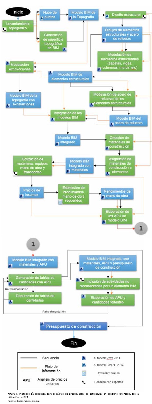 En la Figura 1 (ver págs. 234 y 235) se presenta la metodología para el cálculo del presupuesto de obra de una estructura en concreto reforzado, adoptada para el desarrollo de la investigación. La metodología propone una modificación al método tradicional de cálculo de presupuestos, que consiste en el desarrollo de un modelo BIM para el análisis e integración de la información, la obtención de cantidades de obra, la determinación de las actividades requeridas en la ejecución del proyecto y la generación del presupuesto. La modificación al método tradicional resulta de gran beneficio para la disminución de la incertidumbre en la predicción del costo de construcción de estructuras en concreto reforzado, ya que en el método tradicional la información se almacena de forma dispersa en informes y dibujos en dos dimensiones, que generalmente son incompatibles entre sí e inducen errores en la estimación de cantidades y determinación de actividades.