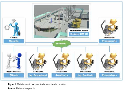 Sin embargo, dado que algunos proyectos de construcción son extensos y cuentan con un alto nivel de complejidad, la elaboración del modelo BIM puede resultar una tarea extensa y poco eficiente, por lo que para agilizar la debida tarea y la comunicación entre los distintos profesionales relacionados con el proyecto, es posible trabajar en una plataforma virtual en red (Shou, Wang, Wang y Chong, 2014). En la plataforma varios modeladores pueden trabajar de forma simultánea. En la Figura 2 se bosqueja una idealización de la metodologia de la elaboración del modelo con el uso de una plataforma virtual.