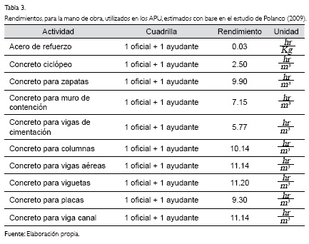 En el proceso de cuantificar los rendimientos se deben tener presentes factores como: el clima, la temperatura, la modalidad de contratación, la experiencia, entre otros (Botero, 2002). Los rendimientos utilizados en los APU del caso de estudio se presentan en la Tabla 3 y fueron calculados con base en el estudio "Análisis de rendimientos de mano de obra para actividades de construcción" (Polanco, 2009), resultado del estudio de rendimientos de mano de obra de una edificación levantada Bucaramanga, Colombia, ciudad donde se construirá la estación de buses en estudio.