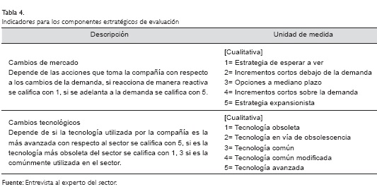 Para la medición de los componentes estratégicos y técnicos, se definieron indicadores específicos que permitieran cualificar o cuantificar el resultado de cada decisión estratégica de capacidad que se quiera evaluar. La descripción de los indicadores y su respectiva unidad de medida se presentan en la Tabla 4, pág 231, para los componentes estratégico y en la Tabla 5, pág 232, para los componentes técnicos.