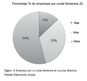 Con respecto al número de mujeres en las juntas directivas, tal como se observa en la Figura 4, de las 67 empresas analizadas el 54% que corresponde a 41 empresas no tiene ninguna mujer en la junta directiva. El 33% que equivale a 25 empresas tiene al menos una mujer y solo el 13%, es decir, 10 empresas tienen dos. Se concluye entonces que un poco más de la mitad de las empresas objeto de nuestro estudio aún no le dan la oportunidad a una mujer para ser parte de su máximo órgano de gobierno, y aquellas en las que sí hay al menos una mujer, la representatividad no es suficiente.