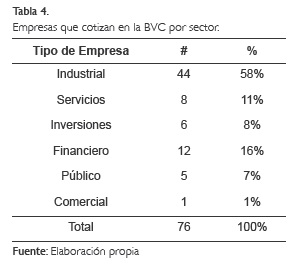 A la fecha de inicio de la investigación, la información pública disponible en las páginas web de las empresas seleccionadas (véase Anexo 1) y en sus informes de gestión o, de responsabilidad social corporativa, estaba actualizada hasta el año 2013, por lo que este fue el año de evaluación. La investigación fue de carácter documental, orientada a la localización, registro, procesamiento, análisis e interpretación de información proveniente de fuentes secundarias (Galeano, 2004), pues se obtuvo los datos de un listado de 76 organizaciones emisoras en la Bolsa de Valores de Colombia procedentes de diversos sectores de la economía clasificadas según aparece en la Tabla 4, pág. 115. Asimismo, a efectos de conocer el género de los miembros de las juntas directivas de dichas empresas solo se tuvo en cuenta a los miembros principales, no se contó a los suplentes.