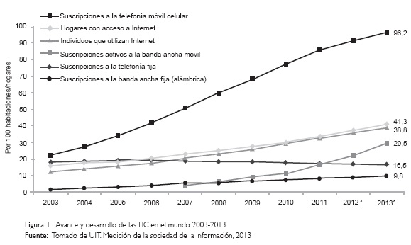 La Figura 1 (pág. 130) muestra el desarrollo histórico de las TIC (banda ancha, teléfonos fijos, banda ancha móvil, personas que usan Internet, hogares con Internet y teléfonos celulares), por cada cien habitantes, en donde el mayor avance se ha dado con los teléfonos móviles. Internet de su parte, se muestra en segundo lugar en el avance y desarrollo de TIC en el periodo 2003-2013.
