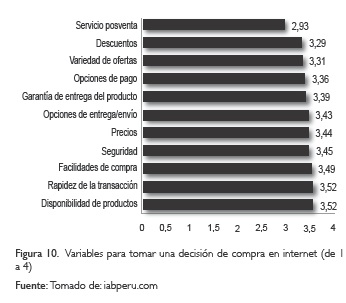 De otra parte, la Figura 10 (pág. 133) presenta los resultados de la Encuesta AméricaEconomía Intelligence (2012), señalando las principales variables consideradas por un comprador digital en Internet, en el momento de tomar una decisión de compra. Las más destacadas en esta decisión actualmente son: disponibilidad del producto, rapidez de la transacción, facilidad de compra, seguridad en el pago y compra. Las variables menos consideradas son: servicio de posventa, descuentos y variedad de ofertas.