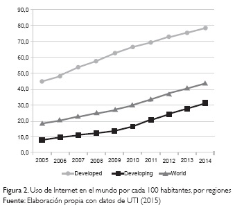 La Figura 2, de su parte, presenta el uso de Internet por regiones económicas. Los países desarrollados expresan su máxima preponderancia. Se destaca la brecha en el uso de Internet entre los países desarrollados y en proceso de desarrollo, señalando la importancia de estas tecnologías en la EC, para el avance de una región.
