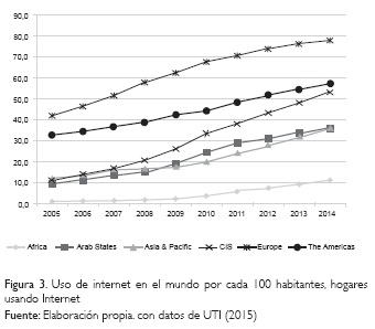 En la Figura 3 se observa el uso de Internet por regiones geográficas. Europa expresa su liderazgo, seguido de las Américas y de países del CIS1, estados árabes, Asia-Pacífico y África en menor grado.