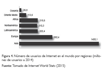 No obstante que Asia-Pacífico ocupa el quinto lugar en el uso de Internet en el mundo, por cada cien habitantes, su potencia muestra que es la región con el mayor número de usuarios de Internet totales, por ser densamente poblada (Ver Figura 4, pág. 131).