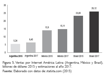 Siguiendo con algunos países de América Latina, en el año 2015 Argentina presenta ventas de 5,24 billones de dólares; México de 13,9 billones de dólares y Brasil de 23,05 billones de dólares. (Ver Figura 5). Se estima que para el año 2017 las ventas se incrementen para estos mismos países así: Argentina 6,45 billones de dólares, México 15,ll billones de dólares y Brasil 26,12 billones de dólares. A la par, teniendo en cuenta la información suministrada por www.enter.co (2015) en Colombia más de 24 millones de personas utilizan la red de Internet y existe una parte de la población que realiza compras por dicho medio. El país representa el l% del comercio electrónico en el mundo y crece en un porcentaje del 30% anual. En esta misma página Web se afirma que cuponatic.com.co suministró cifras que indican que al 2012 se facturaron cerca de 2.000 millones de dólares en medios electrónicos.