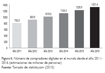 El número de compradores por Internet en el mundo se muestra en la Figura 6 (pag. 132), en el periodo 2011 a 2015 y las estimaciones para 2016. Los datos señalan un crecimiento del 55% en el número de personas que compran por Internet en cinco años, y estiman un crecimiento del 7,5% para el año 2016. De manera que el número de compradores pasaría de 792,6 millones a l.228,5, mostrándose un proceso de crecimiento.