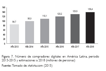 El número de compradores por Internet en América, según statista.com (2015) se ha ido incrementando de 84,7 millones de personas en 2013 a 110,0 millones en 2015, significando un 77% de la población con acceso a Internet. Se estima que para el año 2016 esta cifra puede alcanzar los 120,2 millones de personas y para el año 2018 se espera llegue a 139,4 millones, comprando de manera digital, en esta zona geográfica (Ver Figura 7).