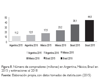 Los países de América Latina que mayor número de compradores tienen en Internet son Argentina, México y Brasil, con 11,2; 17,5 y 36,1 respectivamente. En ellos se espera un crecimiento para el año 2018 a 12,5; 23,2 y 44,8 correspondientemente (statista.com, 2015). (Ver Figura 8).