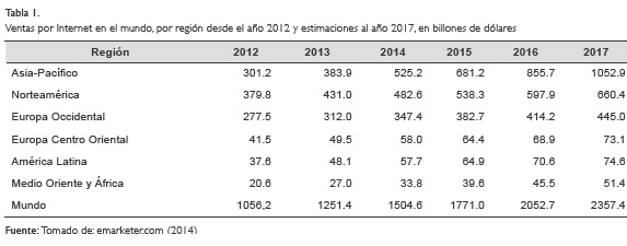 En la Tabla 1 (pag. 131) se observa cómo Asia-Pacífico viene incrementando sus ventas por Internet pasando de 301,2 billones de dólares en el año 2012 a 681,2 billones de dólares en 2015. Las estimaciones esperan que para 2017 las ventas en esta región sean de l.052,9 billones de dólares, superando a Norteamérica, de quien se esperan ventas por 660.4 billones de dólares y Europa Occidental con 445,0 billones de dólares. América Latina continuará con un crecimiento conservador que exhibe 37,6 en el año 2012 con un crecimiento al año 2015 de 64,9 billones de dólares. Se estima al año 2017 ventas por Internet de 74,6 billones de dólares. De hecho, la pregunta anterior empíricamente empieza a tener respuesta para América Latina.
