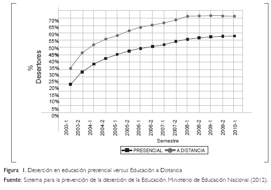 Sin duda alguna, el abandono es uno de los problemas so-cioeducativos que ocupa un espacio significativo en la administración universitaria mundial. Desde diferentes departamentos o unidades académico-administrativas de las IES, se han adelantado estrategias de permanencia estudiantil con base en los enfoques teóricos de autores como Tinto (1989), Spady (1970) y Cabrera, Castañeda & Nora (1992); no obstante, estas acciones difícilmente disminuyen el abandono estudiantil en programas académicos con metodologías alternativas como la educación a distancia, donde los índices de abandono estudiantil están por encima del presencial en un 20% (Figura 1).