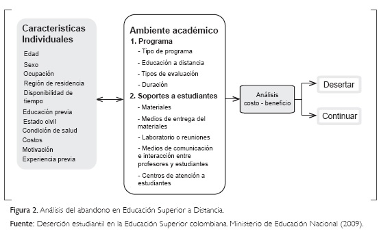 Así pues, el abandono en el sistema educativo a distancia comprende elementos propios al de la modalidad presencial: características individuales, integración académica y social, así como el costo-beneficio (económico); no obstante, con una naturaleza que los diferencia rotundamente a partir del tipo de programa cursado, escasas tutorías, poca información sobre la metodología y soporte institucional para lograr procesos satisfactorios de enseñanza-aprendizaje.