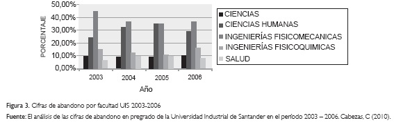 La Universidad Industrial de Santander-UIS como institución social de gran impacto en el nororiente colombiano, no es ajena a la realidad del abandono escolar; por tanto, avanza en el diagnóstico de las motivaciones de deserción escolar presentadas por los estudiantes de los diferentes programas. En los años 2009 y 2010, la UIS ha adelantado estudios en el tema desde la Escuela de Trabajo Social, con la finalidad de profundizar en las causas que llevan a los estudiantes a tomar la decisión de desertar en sus estudios. En el primero de ellos "El análisis de las cifras de deserción en pregrado de la Universidad Industrial de Santander en el período 2003 - 2006" (Cabezas, 2010), se identifican las cifras de retiro forzado durante los periodos 2003-20066 (Figura 3).