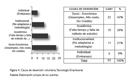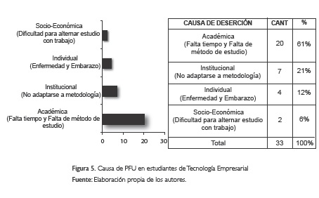 Si bien las principales causas de abandono en los estudiantes de las últimas V cohortes de los programas Tecnología y Gestión Empresarial (2007-2009), son de orden socioeconómico, teniendo en cuenta que la situación de desempleo de varios de ellos una vez iniciados sus estudios, los obligó al abandono por cuanto consideraron alto el costo del semestre en proporción a sus ingresos, y académicas a causa de las pocas horas de preparación de las actividades; asimismo, estos factores laborales se interconectan con otras variables que ralentizan los procesos de integración social y académica de los estudiantes de Tecnología y Gestión Empresarial.