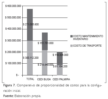 El valor de los costos de mantenimiento y distribución asumiendo que se utiliza esta configuración y tomando como valor de entrada la simulación de la demanda en un lapso de 16 meses es igual a $ $ 571.198.000, es decir, que en promedio la empresa está destinando un total de $ 35.699.875 al mes para soportar su operación de distribución a los diferentes nodos de demanda, el costo correspondiente al rubro de transporte es $ 300.112.200 que en proporción representa el 53% de los costos totales de mantenimiento y distribución, dejando el 47% restante al mantenimiento del inventario que equivale a un total de $ 271.085.800, lo anterior se puede ver en la Figura 7. Comparativamente, el CEDI Buga presenta un mayor valor en sus costos logísticos de distribución ($ 370.730.000) de acuerdo a esta configuración de red, presentando así una diferencia con respecto a Palmira de $ 170.262.000 ($ 200.468.000 para Palmira). En cuanto al componente de transporte la diferencia del centro de distribución Palmira comparado con Buga es del 62,93% ($ 81.164.200 y $ 218.948.000 respectivamente). Por último, para esta configuración existe una diferencia de $ 32.477.000 en costos de mantenimiento de inventario, siendo más alto este rubro logístico para el Centro de Distribución Buga ($ 151.781.000).