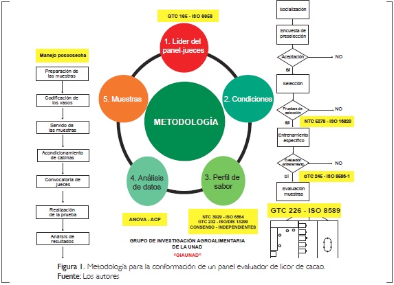 En la conformación del panel para el proyecto se toma como guía metodológica la aplicada por los autores en los proyectos "Evaluación sensorial del cacao producido en San Vicente de Chucurí" (2011), y "Evaluación de la calidad sensorial del grano de cacao en tres pisos térmicos de la zona de San Vicente de Chucurí para los clones CCN 51, ICS 60 e ICS 95". (2013) y en el desarrollo actual del proyecto "Evaluación sensorial del cacao producido bajo diferentes modelos de siembra desarrollados en cuatro regiones de Colombia".