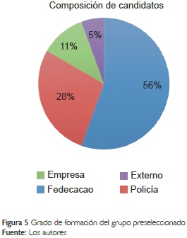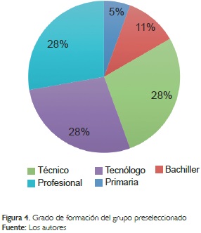La Figura 4 muestra que el 28% de los preseleccionados poseen formación primaria, el 56% formación técnica y tecnológica y el 28% son profesionales de diferentes disciplinas.