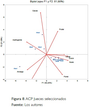 En la Gráfica ACP - Figura 8 se evidencia una agrupación de cinco jueces con tendencia a los sabores verde, dulce y nuez. El juez 1 se encuentra alejado del grupo con tendencia al sabor amargo y los jueces 2, 3, y 4 agrupados al sabor a cacao y la sensación astringente. Este análisis implicó un refuerzo del entrenamiento.