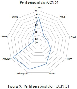 Se confirman con el perfil obtenido para el clon CCN51 las características predominantes para el mismo como son el sabor a cacao, nuez y muy poco de floral y frutal, así como la presencia de sabores que afectan la calidad como son el ácido, amargo y astringente causados en su mayoría por una fermentación mediana.