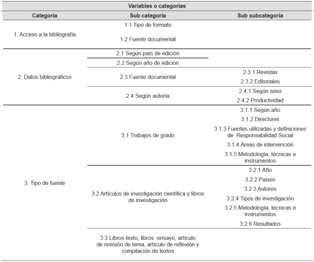 Para el análisis de los datos se hizo una matriz de análisis representada en la Tabla 1, que permitió organizar la información, las categorías ejes consistieron en: acceso a la bibliografía, es decir, las formas como se obtuvieron los documentos; los datos bibliográficos, o características básicas de los documentos y sus autores; tipo de fuente, relacionado con los contenidos y formas de abordar la Responsabilidad Social. Cada una de las categorías y subcategorías fue emergiendo a raíz de la lectura preliminar de los textos.