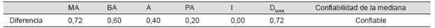 Como DMax > Dt (0,600 >0,575) se rechaza la hipótesis nula H0.Luego se puede afirmar que hay diferencias significativas en los criterios y que la mediana es confiable por lo que se puede considerar para la población. Por tanto se puede afirmar que la tendencia es de evaluar bajo la preparación didáctica del docente de lengua inglesa, a fin de dirigir el proceso de enseñanza-aprendizaje en las habilidades lingüísticas de expresión escrita y de lectura, según la prueba de Kolmogorov-Smirnov con un 99% de confiabilidad. (Ver Tablas 4 y 5).