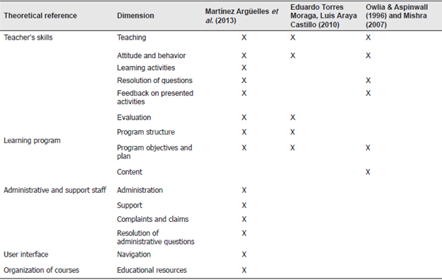 Following this study, we present in greater detail the studies by Martínez Argüelles et al. (2013), Torres Moraga & Araya Castillo (2010), and Owlia & Aspinwall (1996) because, in terms of PSQ in online learning, in their contributions there are factors that are relevant for this study. The details are shown in Table 1.