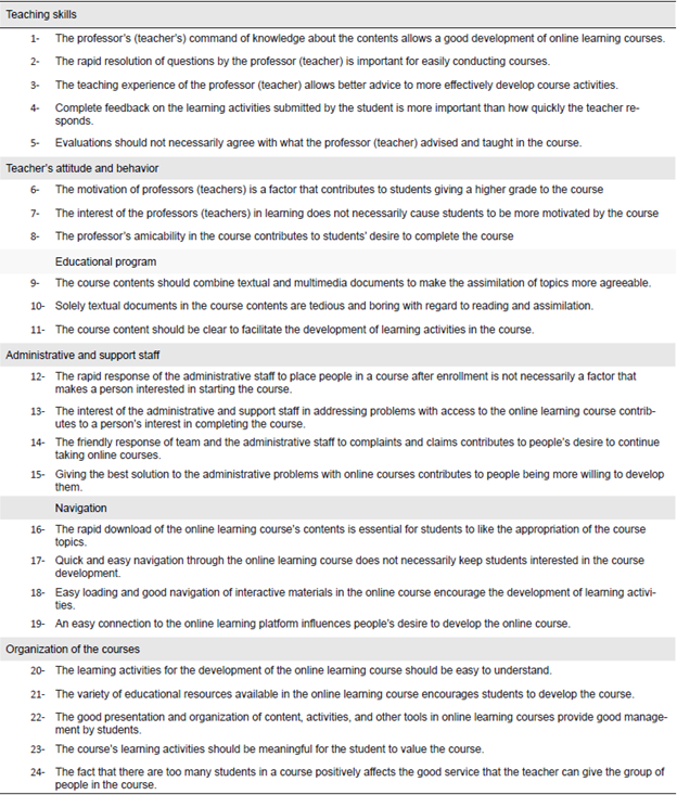 Based on the literature review, the dimensions for the measurement instrument were identified (Churchill, 1979) for PSQ in continuing online learning. Based on this process, they were defined and are presented in Table 2. Thus, using the definition of the dimensions, items, and scaling, a list was made to capture the domain specified and we proceeded to choose the scaling technique (Zapata Rotundo & Canet Giner, 2008), with the Likert scale chosen for this study.