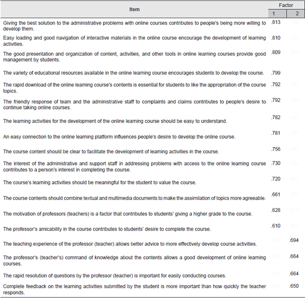 In order to identify the factors that compose the perceived quality by students of continuing education in virtual modality, a factor analysis was applied. This type of analysis allows to establish which aspects, represented by the statements contained in the questionnaire, are grouped together to form dimensions or factors that allow interpreting the perception of quality that they have regarding the virtual continuing education service they have received. To achieve this, first, the reliability measurement from Cronbach's alpha was obtained, with a result of 0.941, which is suitable for a scale in marketing (Bruner, 2012), and the result does not improve by deleting items. Similarly, the results of confirmatory factor analysis with varimax rotation and the principal component extraction method generate two factors that meet the criteria defined for this study (see Table 3), the same that subsume the 24 attributes of the scale from which it was initially started. It is important to realize that they explain 64.5% of the variance.