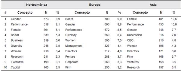 La cuantificación de los términos que más se repiten en las investigaciones permite conocer las variables analizadas y el enfoque particular que se tuvo en la investigación. Por esa razón, este análisis se direccionó como un estudio regional por continente, ejecutado a través del software para el análisis cualitativo de datos ATLAS.Ti, considerando así el contexto organizacional que brindan Norteamérica, Europa y Asia respectivamente. En la Tabla l se muestran los diez conceptos más relevantes identificados en las investigaciones de los tres continentes mencionados.