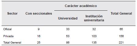 Tabla 1 Desglose de las IES colombianas por sector por seccional y por carácter académico.