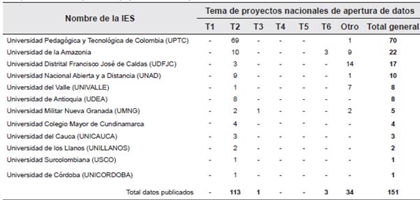 Tabla 6 Datos publicados clasificados por temas de proyectos nacionales de apertura de datos