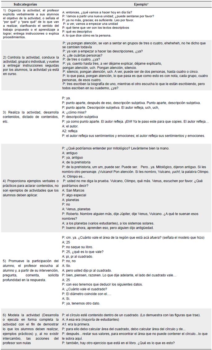 En esta categoría, se distingue la intencionalidad a la base de las acciones realizadas por el profesor en el transcurso de la clase. Se consideraron las siguientes subcategorías: l) organiza la actividad, 2) controla la actividad, 3) realiza la actividad, 4) proporciona ejemplos verbales o prácticos, 5) promueve la participación de los alumnos y 6) modela la actividad. En la Tabla 3 se muestra la definición de cada una de ellas y un ejemplo.
