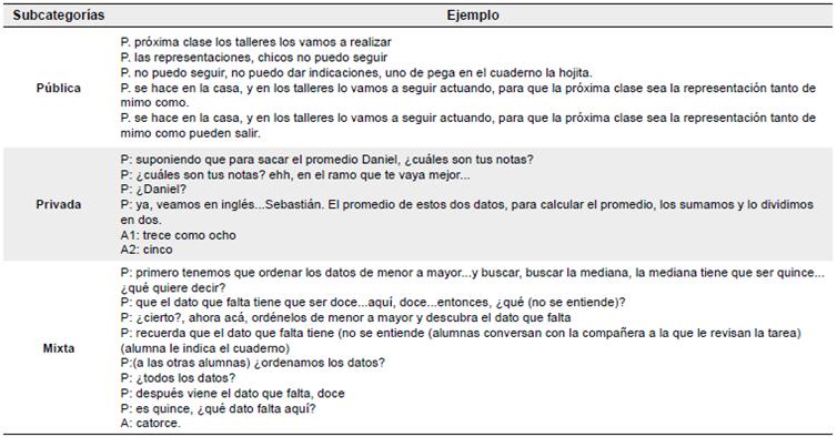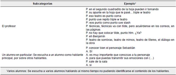 Esta categoría identifica al sujeto que realiza una intervención verbal que sobresale en el grupo en la unidad de tiempo de observación (Martinic y Vergara, 2007). Se identificaron como subcategorías: 1) profesor; 2) un alumno en particular; 3) varios alumnos; 4) ruido: ruido en la sala que no permite identificar al hablante principal; 5) silencio: No se identifica a un hablante principal, la o el profesor(a) no habla y tampoco se escucha a los estudiantes y 6) otros medios: se utilizan otros materiales (videos, música, pizarra) o no hay intervenciones. En la Tabla 4 se registran ejemplos para las tres primeras subcategorías.