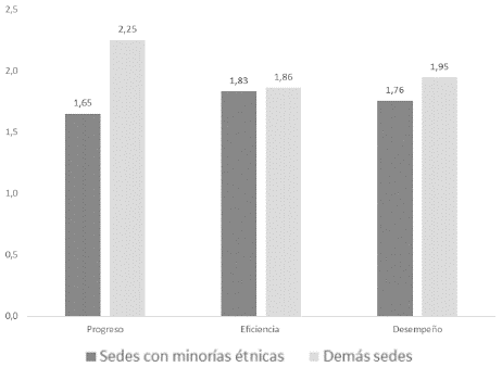 En la Figura 2 se muestra el comportamiento de cada uno de los competentes del ISCE. Los valores de las dimensiones de progreso y desempeno varian entre 1 y 4 cada uno, mientras que el valor máximo de la dimensión de eficiencia es de 2. El componente que presentó mayor rezago entre las sedes con estudiantes miembros de minorías étnicas fue el componente de progreso. Respecto a los componentes de eficiencia y desempeno no se encontraron diferencias significativas, aunque en cualquier caso fueron menores para las instituciones que atendieron a minorías étnicas en todos los componente