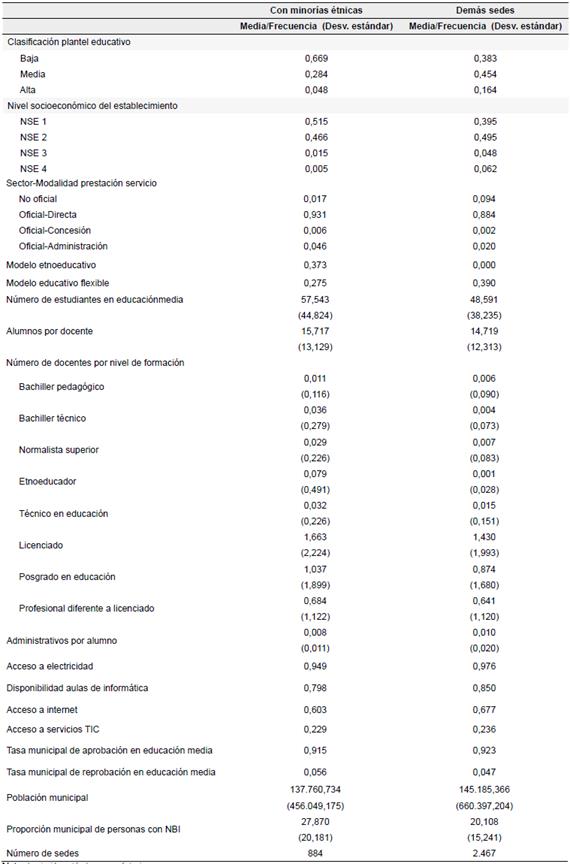 En la Tabla 1 se analizan algunos insumos de la gestión escolar, como los indicadores de eficiencia institucional, el nivel educativo de los docentes, y la implementación de modelos educativos. Además, se consideraron otras características generales de los centros educativos. Estas variables se comparan entre las sedes rurales que atendieron a minorías étnicas y las demás sedes rurales colombianas para el ano 2019.