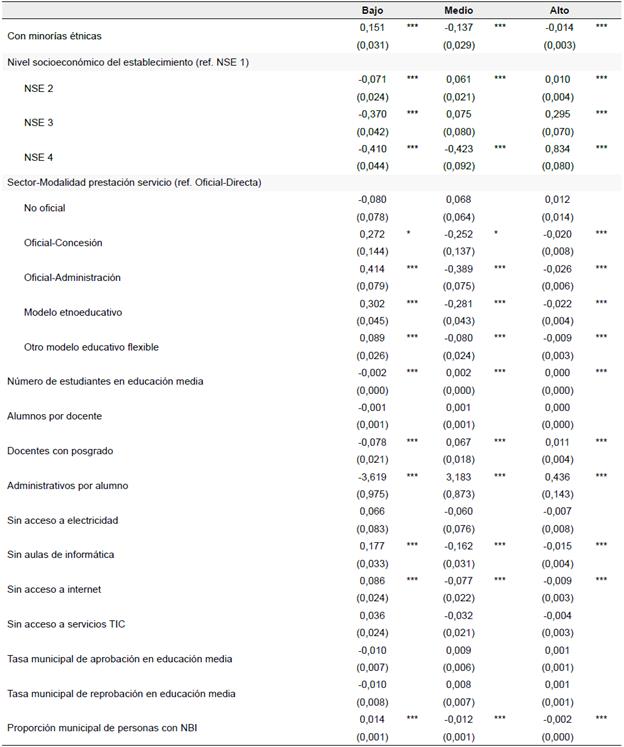 De esta forma, se analizó la incidencia de los factores institucionales sobre la probabilidad de que la sede hubiera presentado un nivel bajo, medio o alto de desempeno académico. Como grupo base de comparación se consideró una sede educativa con las siguientes características: estaba ubicada en Antioquia, no atendió a estudiantes pertenecientes a minorías étnicas, con un NSE de primer nivel, del sector oficial, modalidad prestación directa del servicio, con un modelo educativo tradicional. Además, tenía acceso a electricidad, internet, con aulas de sistemas y acceso a servicios TIC. Por otro lado, no contaba con docentes con formación Posgradual. Las demás variables de control se fijaron en el promedio de la muestra.