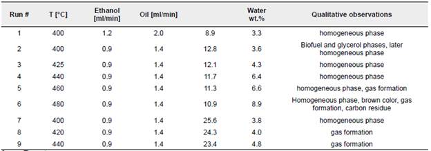 As can be observed in Table I, all collected effluents formed a homogeneous phase, and no phase separation was observed even after 30 days of storage at room temperature conditions. Based on previous experimental results (Marulanda-Buitrago and Marulanda-Cardona, 20I5), a near I00% conversion of triglycerides is expected even at the mildest reaction conditions studied (run I). However, different qualitative observations and water measurements were carried out depending on the reaction temperature and residence time. Effluent samples runs I-6 showed an increment in water content with increasing temperature. Gas formation was observed at 460 °C (run 5) with a residence time of II.3 min. Soot formation was observed at 480 °C (run 6). Residence times longer than 20 minutes resulted in gas formation and lower water content at temperatures above 420 °C (runs 8-9). Gas formation can be attributed to thermal degradation reactions resulting from a prolonged residence time. Similar observations were made by Sakdasri et al. (2015) in the continuous production of biofuel from refined oil and methanol at low molar ratios, in which residence times longer than 20 min at 400 °C resulted in decreased ether content.