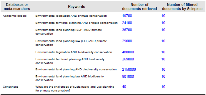 A systematic review of legal and technical literature was carried out using following keywords, as well as Boolean operator AND: environmental legislation; environmental territorial planning; environmental land planning; primate conservation; and biodiversity conservation. Databases or meta searchers consulted were: Academic Google; Scispace and Scopus. Matching articles in filtered search categories were further analyzed (Annexes, Supplementary Table 1).