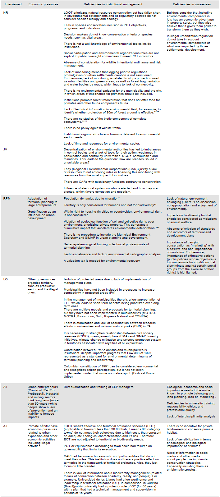 The amount of normative and management tools at municipal level had generated unconformities between actors participating in environmental territory ordinance (Santaella Quintero, 2018), as was expressed by our interviewers. Additionally, it is important to highlight that planning tools in Colombia does not meet necessary governability to its execution (Molina Orjuela, 2014), like what was highlighted by our interviewers (Annexes, Supplementary Table 2).
