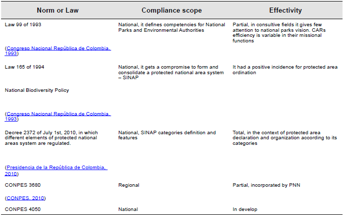 Colombian political constitution of 1991, also consider that "It is a State and people liability to protect cultural and natural richness of the Nation" (Article 8)(República de Colombia, 1991). In consequence Law 99 of 1993 create Ministry of Environmental and National Environmental System (SINA by its acronym in Spanish), to harmonize responsibilities of different entities that shares natural resource management. This system also covers National Parks, National Authority of Environmental Licenses and it creates Regional Environmental Corporations (PNN, ANLA and CAR by its acronyms in Spanish, respectively) with a decentralization focus (Congreso Nacional República de Colombia, 1993). However, it is only until 1997 with Law 388 that territorial ordinance responsible is defined in Colombia: each town/city (Congreso Nacional República de Colombia, 1997).