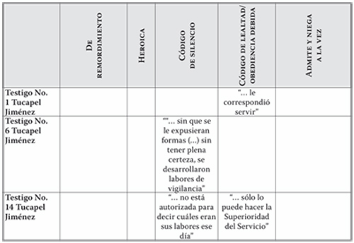 En este primer grupo sobresalen las frases que reflejan la disciplina a la que estaban subordinados los agentes de inteligencia durante este período y que, según nuestra tesis, aún está presente en los testigos, a pesar de que muchos de ellos se han acogido a retiro. Esto ilustra cómo la cultura militar se perpetúa, especialmente si consideramos que los reportes emanados de autoridades superiores, siguiendo la jerarquía militar, no eran cuestionables en cuanto a la información que contenían como tampoco a los métodos de interrogación que se utilizaban. Esto es, los testigos no expresan cuestionamiento de las órdenes, característica clave del entrenamiento militar. Así mismo podemos comprobar cómo la normativa de obediencia debida antepone los intereses institucionales por sobre los intereses individuales16. En estas declaraciones podemos observar un claro desconocimiento de la víctima. Si miramos detalladamente la sintaxis de sus declaraciones también se puede decir que se observa una marcada tendencia al uso de la voz pasiva como por ejemplo "... sin tener plena certeza (...)se desarrollaron labores de vigilancia" (sexto testigo). Esta tendencia a nuestro juicio marcadamente recurrente se da en testimonios donde los responsables tendrían que haber asumido la responsabilidad que les cabía en los hechos. En esta cita, no hay explicación -ni siquiera una referencia- de quién realizó estas labores.