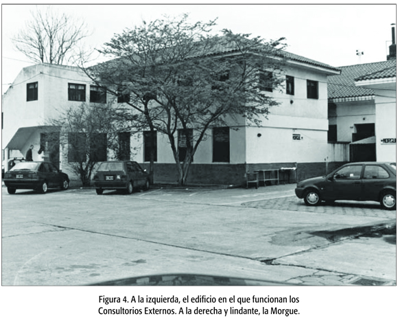 La perspectiva del espacio del servicio hospitalario para estos profesionales asumidos como "psicoanalistas" era la de dos ámbitos separados, diferenciados, opuestos: uno familiar, los consultorios externos, y otro extraño o ajeno, la sala de internación, frecuentemente subsumida en el resto del hospital. La estructura arquitectónica del servicio contribuía fuertemente a afianzar esta concepción. cualquier visitante desprevenido que se dirigiese al servicio no tendría modo de saber que no se trataba de una sola unidad arquitectónica, sino de dos. Luego, enterado, podría no percatarse de la existencia de un acceso diferente para cada una. casi con seguridad, encontraría sin problemas el sector de "internación": ingresaría por la puerta principal, ascendería por una escalera central o por alguno de los ascensores y caminaría hacia la derecha, en dirección opuesta a la de una capilla ubicada en una de las alas. Pero se sorprendería de no poder encontrar allí los consultorios externos. Lo primero que haría sería preguntar en qué piso del hospital están. La respuesta pondría en evidencia la futilidad de su consulta: no estaban dentro del edificio principal, sino fuera del mismo. Entonces, bajaría nuevamente, saldría a la playa de estacionamiento, pasaría delante de los pequeños edificios de la morgue y de anatomía patológica y, finalmente, los ubicaría junto a éstos (figura 3). pronto advertiría que para llegar a ellos no necesitaba ingresar por la puerta principal y atravesar toda la planta baja del edificio, sino simplemente entrar por la puerta de entrada de vehículos. Esta disposición acentuaba la imagen de autonomía de los consultorios externos (figura 4).