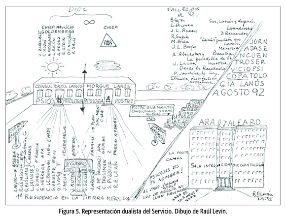 Durante una conmemoración de la creación del servicio realizada en 1992, Raúl Levín, un psicoanalista que fuera residente de psiquiatría en la década de 1960, confeccionó un dibujo a través del cual pretendió representar su visión alegórica de la arquitectura del servicio. Una línea diagonal dividía el papel de 30 x 21,5 cms. En dos partes desiguales, la mayor reteniendo más del 70 por ciento de la superficie. En esta última aparecían los consultorios externos, mientras que en la porción pequeña se ubicaba, ¡el resto del edificio del hospital! aquí podía leerse por encima del mismo el nombre "Aráoz Alfaro" es decir, conservaba la denominación que tenía el hospital cuando él trabajaba allí, y en el segundo piso del edificio, "sala internación psicopatología". La asimetría que guardaban las dos partes del plano no correspondían, por supuesto, con las proporciones reales. Era el edificio del hospital el que debió haber sido representado como de mayor tamaño. Sin embargo, él sostenía que de ese modo pretendía simbolizar la importancia que, desde su perspectiva, tuvieron los consultorios externos. Sólo la pertenencia a un mismo soporte material la hoja de papel hacía del dibujo una unidad. En verdad, se trataba de dos imágenes. Los consultorios externos aparecían desplazados hacia la izquierda y ligeramente hacia arriba, rodeados por un inmenso espacio vacío que representaba la playa de estacionamiento. La pequeña porción restante estaba ocupada por el edificio principal del hospital, "arrinconado" al ángulo inferior derecho. El efecto era no sólo de oposición, sino de lejanía y desconexión entre ambos predios. En su explicación del dibujo, Levín ubicó los consultorios externos "en el último confín", teniendo por referencia el edificio del hospital. Un ortoedro cortado exactamente a la mitad por una línea que lo dividía en dos partes simétricas representaba los consultorios externos por un lado, y la morgue por el otro. Esto expresaba una unidad y una escisión a la vez: la misma instalación se desdoblaba en "cuerpos anatómicos" la morgue y "cuerpos patógenos" los consultorios. Un papel fundamental lo jugaban las relaciones adyacentes o de contigüidad con la morgue y el edificio de anatomía patológica (figura 5).