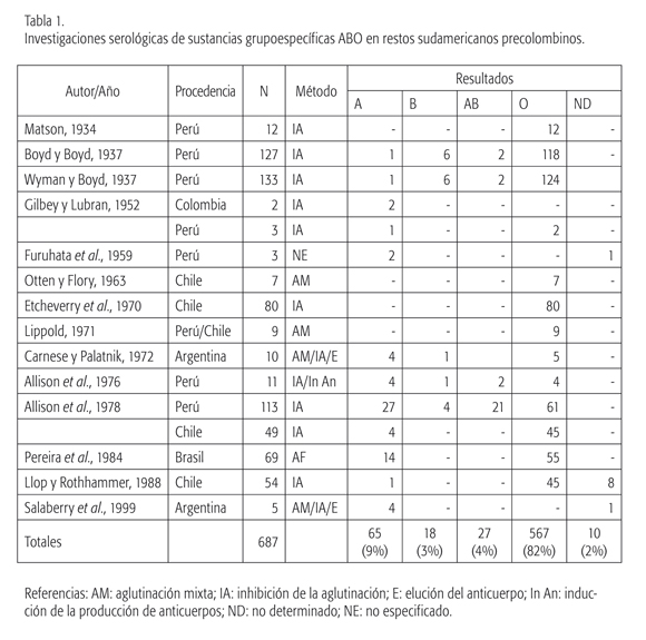 En la tabla 1 se mencionan algunas de ellas, así como las determinaciones realizadas a partir de restos momificados de diferentes regiones de Sudamérica. Se puede observar que los antígenos A y B están presentes, aunque en bajas proporciones, en Colombia, Perú, Chile, Brasil y Argentina. La presencia de B en indios, precontacto con europeos, de la región andina de América del Sur es coincidente con lo remarcado para las poblaciones vivientes de esa misma área. A partir de estos datos se postuló que, si se descarta la acción de factores contaminantes que interfieren en la tipificación de los especímenes, la existencia de los antígenos A y B en América precolombina no sería sólo consecuencia del mestizaje con europeos.
