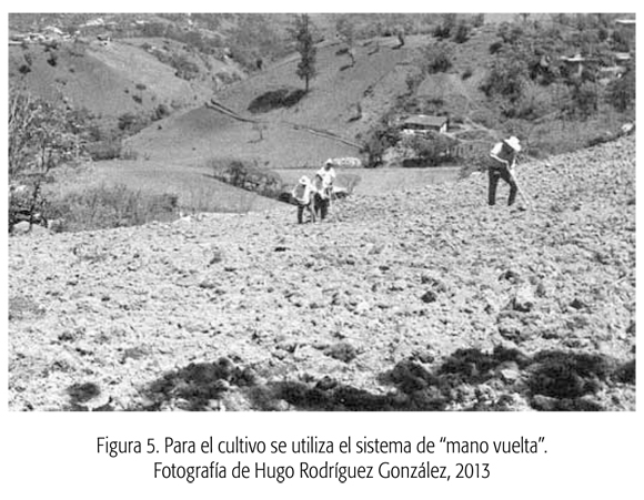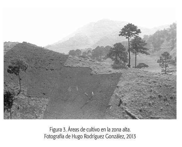 La principal actividad económica de los pobladores de la zona es la agricultura de temporal (ver la figura 3), el cultivo de la milpa2, el cual se realiza con fines de subsistencia, al igual que la recolecta, y en menor medida, la caza y la pesca. También realizan cultivos para el comercio, que corresponden, según la clasificación realizada por Alfaro Martínez y Masferrer (2010) para la Sierra Norte de Puebla, al agroecosistema de café de baja tecnología, en donde los cultivos del café, el chile, la jícama y el cacahuate son realizados especialmente para la venta, y donde el cultivo, debido a lo escarpado del terreno, se realiza utilizando como herramientas fundamentales la coa y el machete.